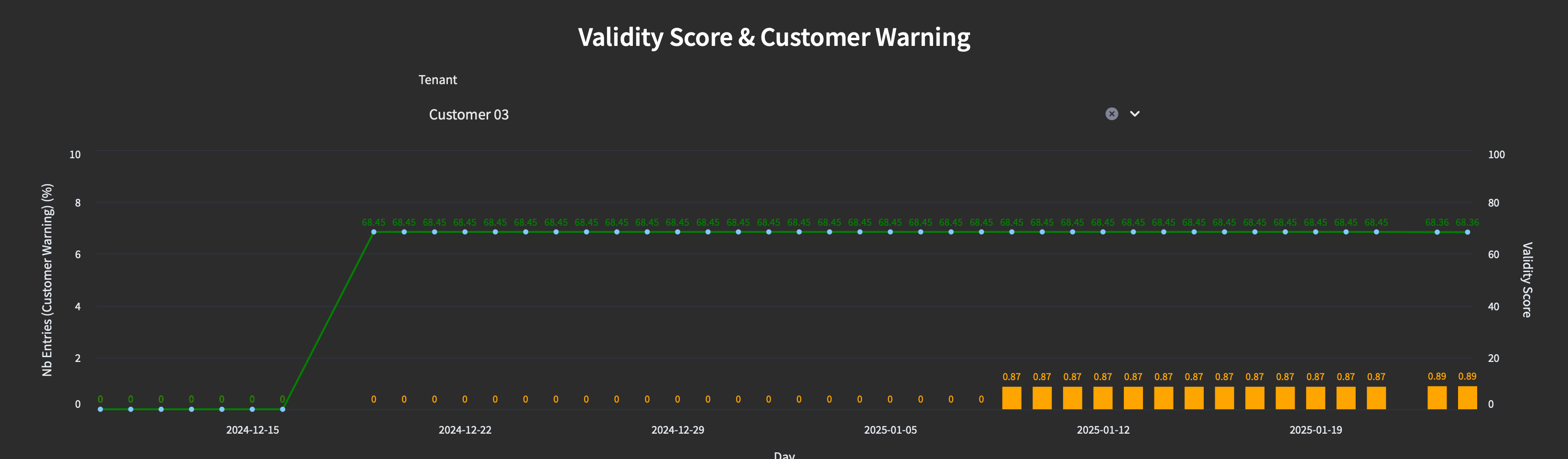 Below, you can see the evolution of the validity score with the line in green and also the evolution of customer warnings detected (in the orange histogram).